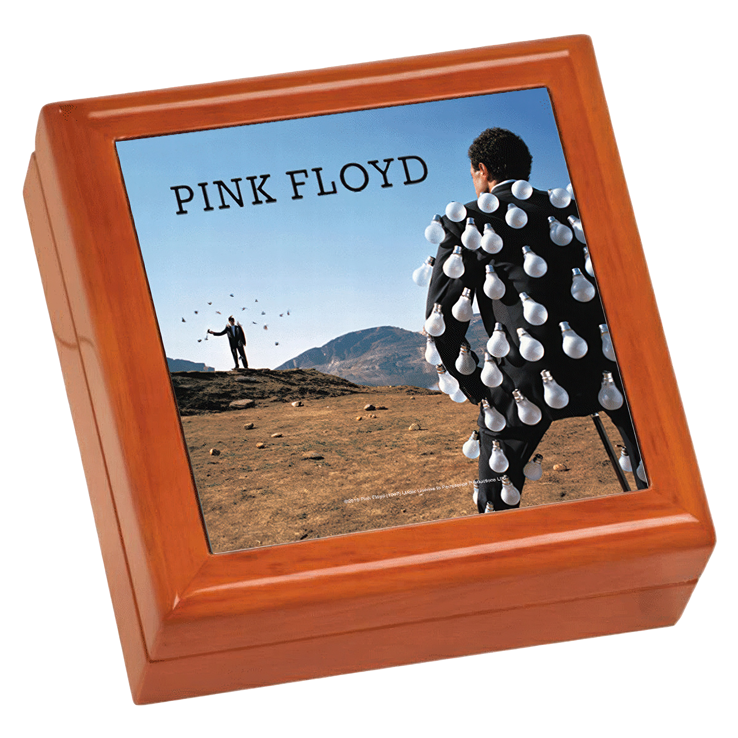 This mahogany-finish wooden keepsake box makes the perfect gift for storing jewelery, coins or watches. It features a full-color ceramic tile inlay of the Pink Floyd artwork. The box measures 5 1/2" x 5 1/2" x 2 1/2" and is felt-lined with a hinged lid. This is a print-on-demand item. Please allow three extra days for processing and shipment of your order.Print-on-demand items may only be returned or exchanged in the case of a damaged item.