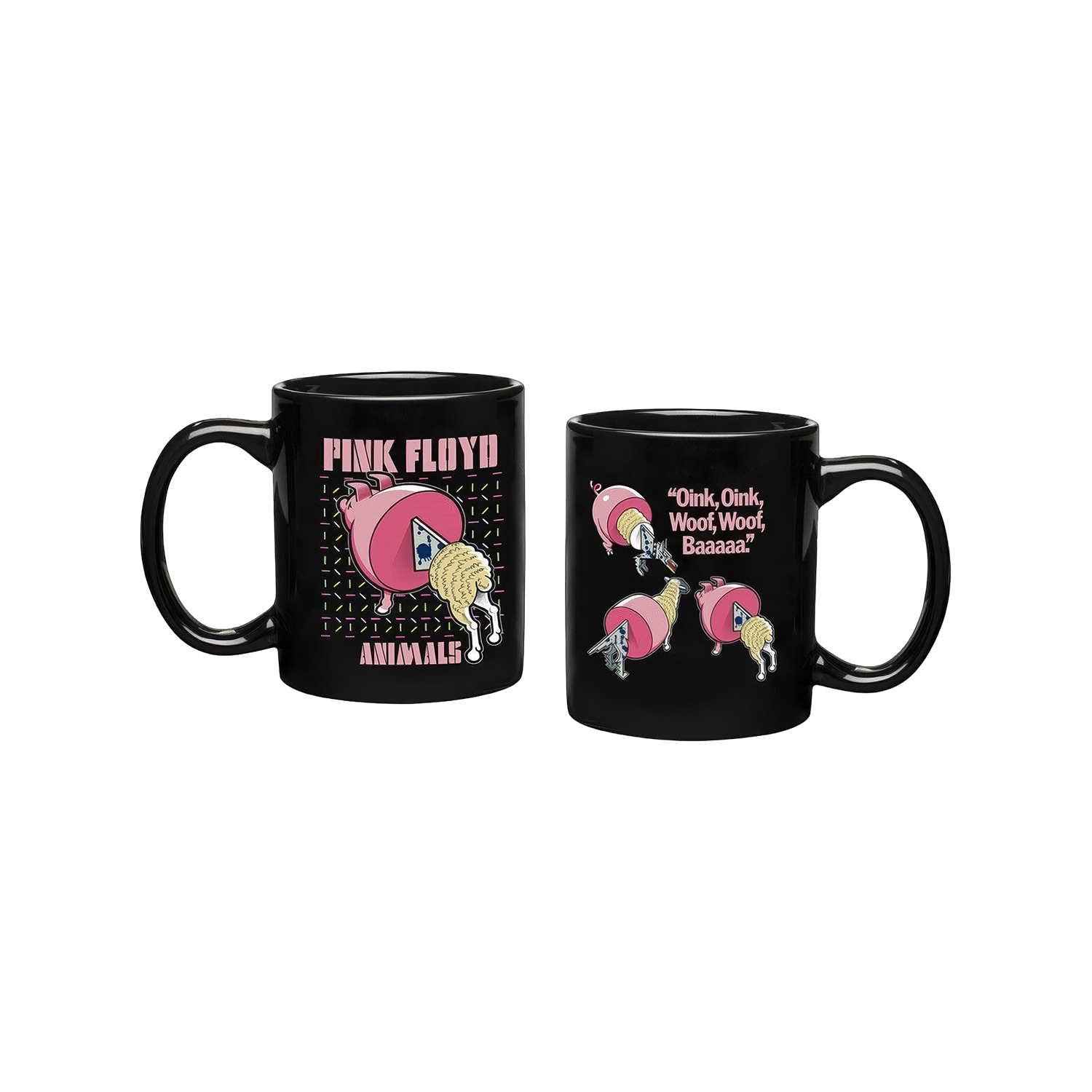 Commemorate the Animals 2018 Remix release with the ""Oink, Oink, Woof, Woof, Baaaaa"" 11oz black mug featuring the Sheep, Dog and flying pig Algie.The iconic 1977 Pink Floyd album has been remixed for the first time by James Guthrie. Animals is a concept album, focusing on the social-political conditions of mid-1970s Britain, and was a change from the style of the bands earlier work. The album was developed from a collection of unrelated songs into a concept which describes the apparent social and moral decay of society, likening the human condition to that of animals. Taking inspiration from George Orwells Animal Farm, the album depicts the different classes of people as animals with pigs being at the top of the social chain, dropping down to the sheep as the mindless herd following what they are told, with dogs as the business bosses getting fat on the money and power they hold over the other. Although its been a long time since 1977, the narrative of the album still resonates today as our social and economic situation mirrors that of the time.