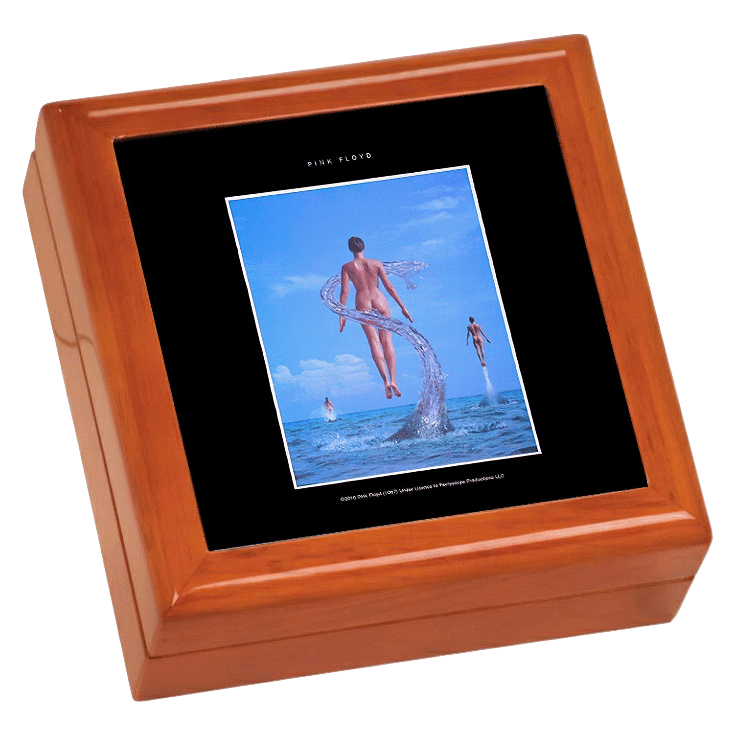 This mahogany-finish wooden keepsake box makes the perfect gift for storing jewelery, coins or watches. It features a full-color ceramic tile inlay of the Pink Floyd artwork. The box measures 5 1/2" x 5 1/2" x 2 1/2" and is felt-lined with a hinged lid. This is a print-on-demand item. Please allow three extra days for processing and shipment of your order.Print-on-demand items may only be returned or exchanged in the case of a damaged item.