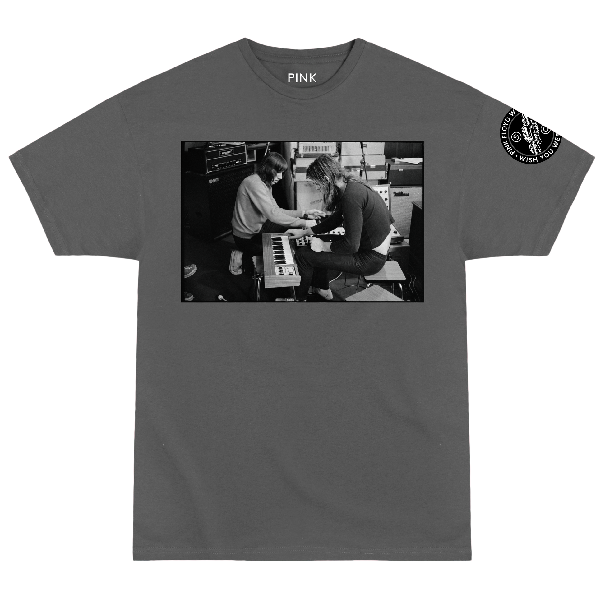 Fifty years later, Wish You Were Here lives on. Commemorate the milestone with the WYWH 50 Collection David & Rodger T-Shirt that features a black and white photo of the pair on the front and the anniversary logo on the sleeve.